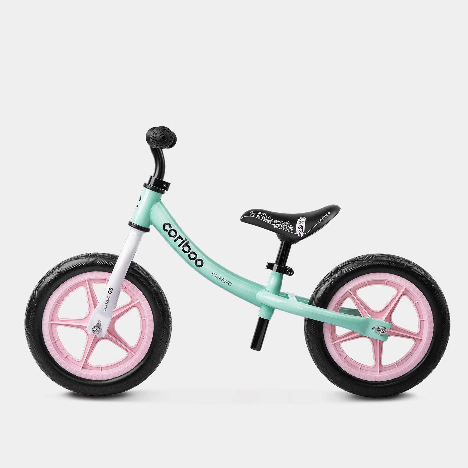 The Cariboo Classic balance bike features a curved frame that simplifies getting on and off for little riders. The soft, printed saddle has an ergonomic shape and adjustable height (33.5–48 cm), making it easy for parents to adapt the bike to their child’s growing needs.