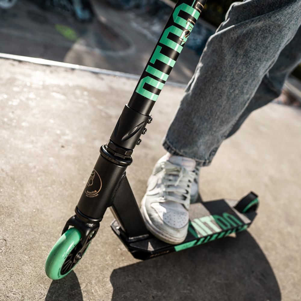 Nitro features bold colours for bold riders. The nylon wheels and grips complement the graphics on the deck and handlebars. If you’re looking for a scooter that will make you stand out at the park, Nitro is for you—striking, uncompromising, and noticeable from afar.