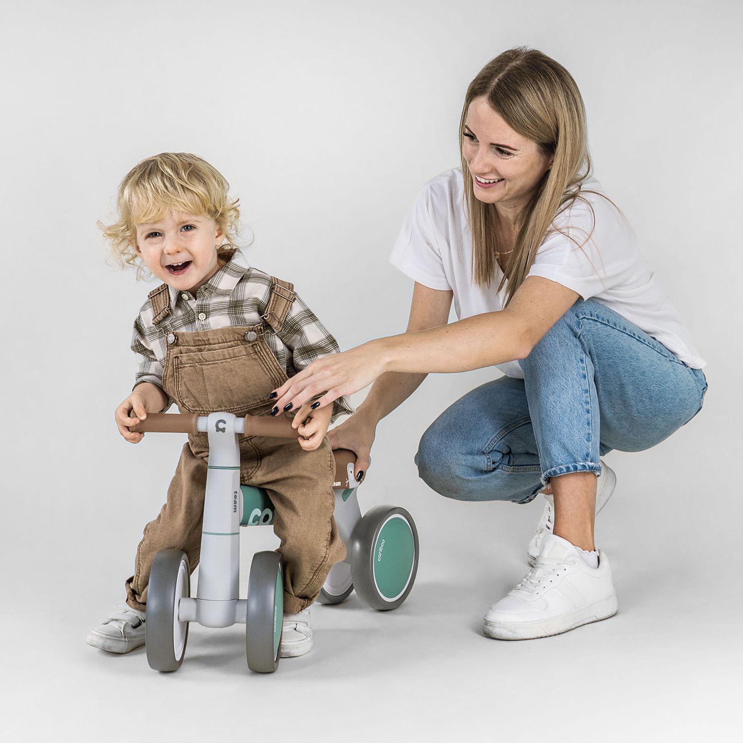 Gracias a su cuadro de aluminio y ruedas de espuma EVA, la bicicleta Team es muy ligera, pesando solo 1.6 kg. Destaca su manillar reversible, que se puede ajustar en posición hacia adelante o hacia atrás, adaptándose a las necesidades del niño. Las empuñaduras suaves y agradables al tacto aumentan la comodidad del paseo y evitan que las manos de los niños se resbalen.