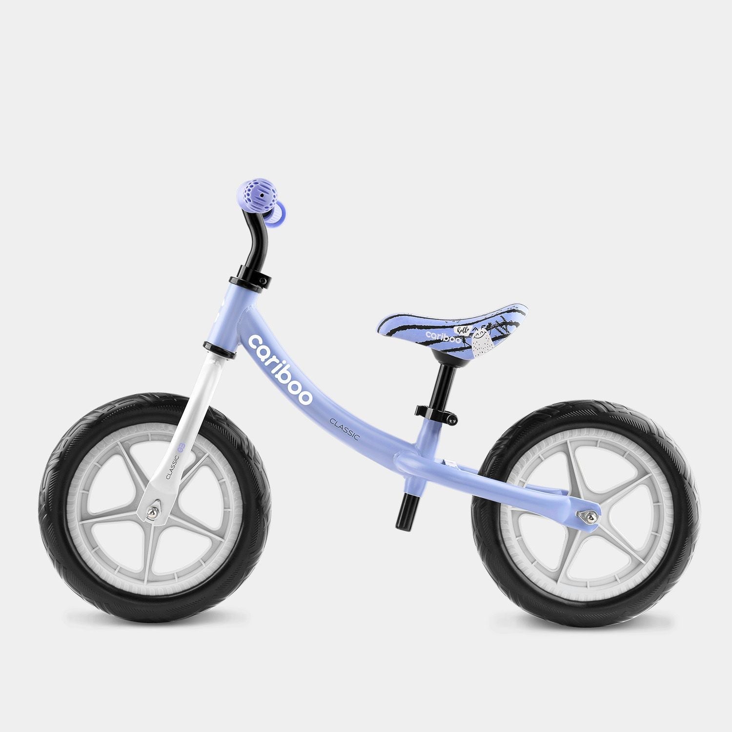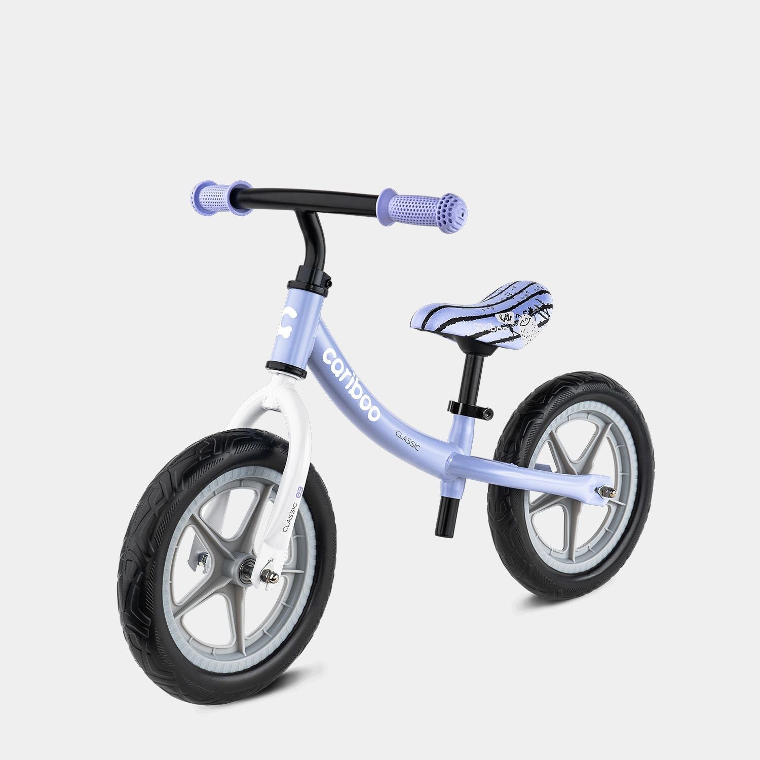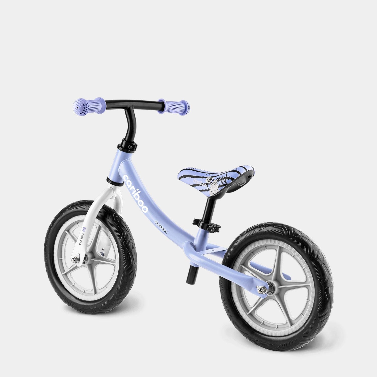 The Cariboo Classic balance bike features a curved frame that simplifies getting on and off for little riders. The soft, printed saddle has an ergonomic shape and adjustable height (33.5–48 cm), making it easy for parents to adapt the bike to their child’s growing needs.