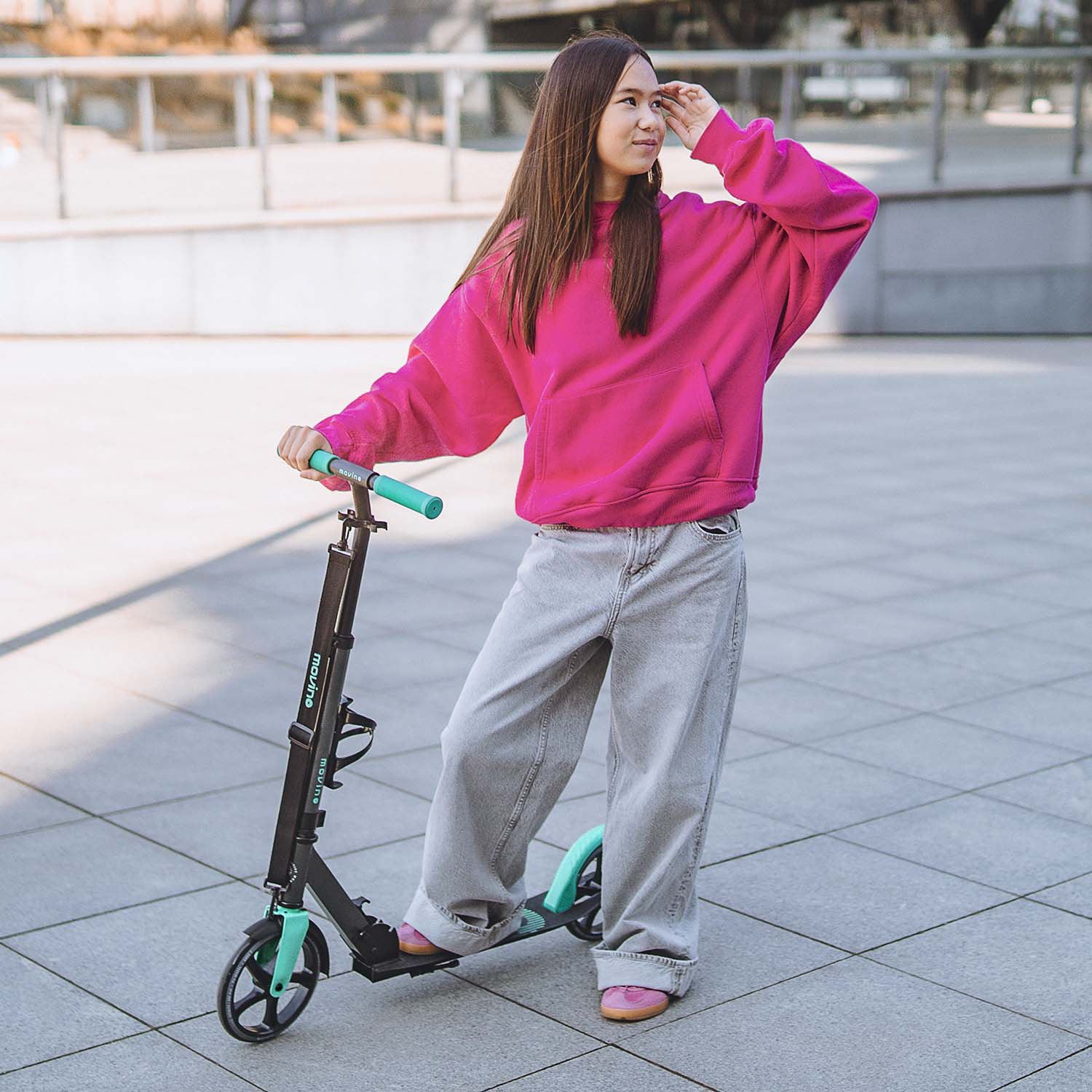 Crianças – tanto as mais velhas como as mais novas – precisam de se deslocar para diversos lugares todos os dias. Para muitos desses destinos, elas podem ir sozinhas com a trotinete Movino Infinity! A sua estrutura leve, plataforma baixa e rodas grandes garantem uma viagem excelente e uma dose diária de exercício saudável!