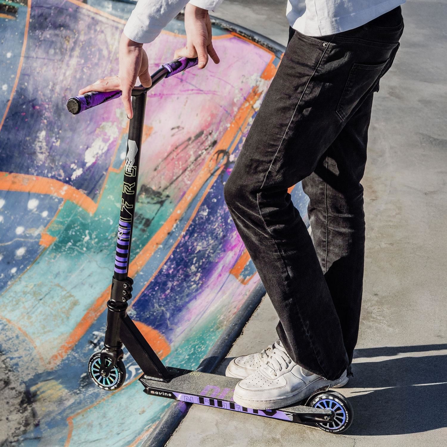 The Movino Nitro Purple is not only a perfectly optimized setup for your first flights in the skatepark but also features stylish painting on the deck, handlebars, and wheels in regal purple. Today, you start learning; tomorrow, you'll rule the spot!